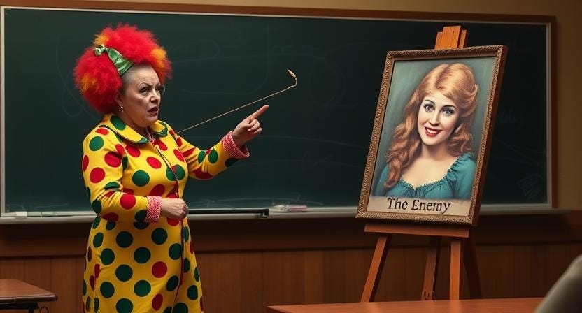 “Sisters in arms,” she begins, as she puts a picture of a beautiful, happy brunette onto an easel: “the woman you see here has been found guilty of the following misdemeanors and crimes, and must be held to account immediately.” She points with a stick to the chalkboard.